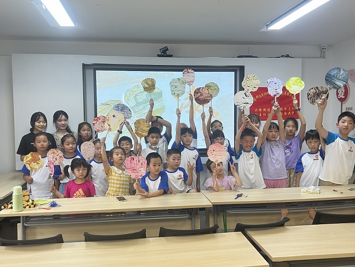 理论讲解之后,最令人期待的动手环节随之而来。孩子们被分为若干小组,在两位大学生的悉心指导下,迫不及待地投入到漆扇制作中。从选材、设计到上色,每一步都凝聚着孩子们的巧思。小小的漆扇在孩子们手中逐渐展现出不同的风貌,有的简约大方,有的色彩斑斓,每一把都独一无二,充满了童真与创意。