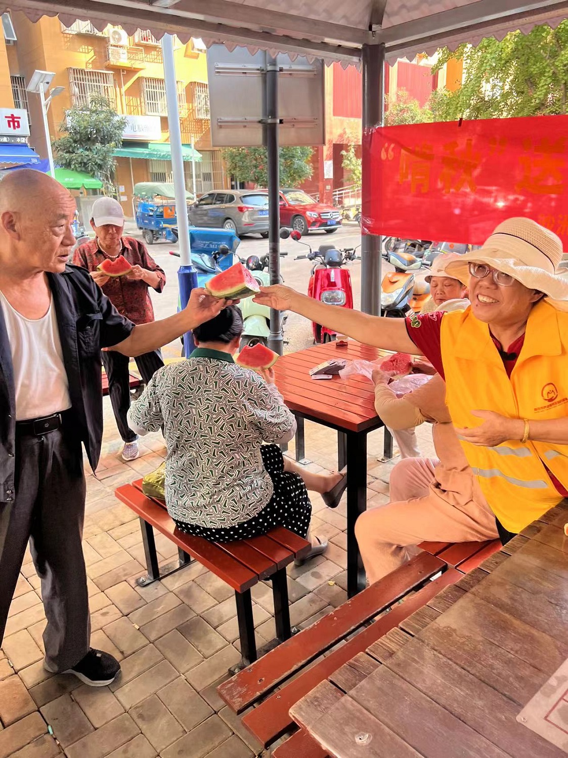 活动当天,莲花南苑社区养老服务互助时间平台服务点为居民们准备了西瓜,摆放在长长的桌子上。老人们围坐在一起,谈笑风生,分享着往年啃秋的趣事。他们或蹲或站,大口大口地啃食着果实,脸上洋溢着满足的笑容。