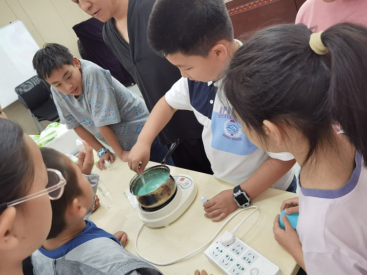 紧接着,赵老师亲自示范了古法香皂的制作过程。从材料的准备到混合、搅拌、成型,每一步都充满了匠心和技艺。在赵老师的指导下,同学们纷纷动手尝试。他们亲手将各种材料混合在一起,感受着材料之间的融合与变化。虽然初次尝试,但同学们的热情不减,每个人都认真投入到了制作过程中。