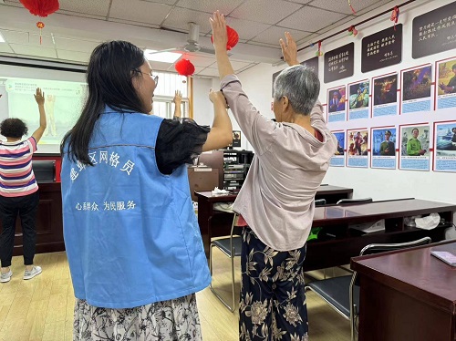 本次活动以“气功八段锦”为主题,旨在通过传统养生功法,提升社区老年人的身心健康。活动伊始,网格员引导长者回顾了上一节的学习内容,并检查了他们在家中练习的“作业”——手指操。这一环节不仅巩固了长者对手指操的掌握,也为接下来的学习营造了轻松愉快的氛围。随后,网格员通过精心准备的视频和PPT,向长者详细介绍了“气功八段锦”的历史渊源、功法特点及其对身心健康的积极影响。生动的讲解和直观的展示,让长者对这一传统养生功法有了更加全面的认识。在理论学习之后,网格员亲自示范并手把手教授长者八段锦的每一个动作。在网格员的耐心指导下,长者们逐渐掌握了动作要领,体验到了八段锦的韵律与美感。通过实践,长者们不仅锻炼了身体,也感受到了身心的放松与愉悦。