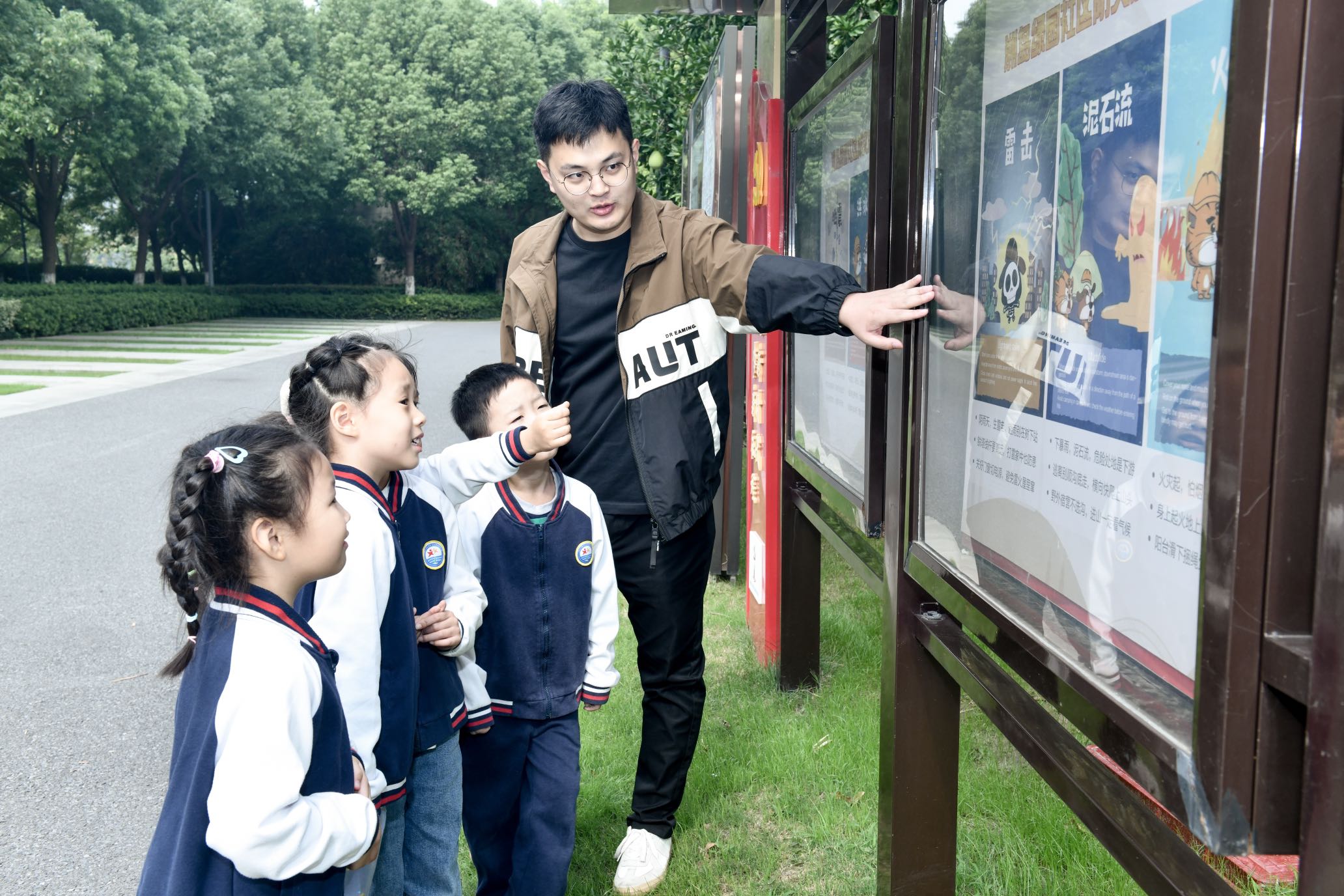 最后,社区网格员带着孩子们来到水木园小区参观了安全应急知识宣传栏,利用生动的图片和详细的文字介绍了地震、雷电、洪水发生时的应急逃生技巧,孩子们听得聚精会神,收获满满。