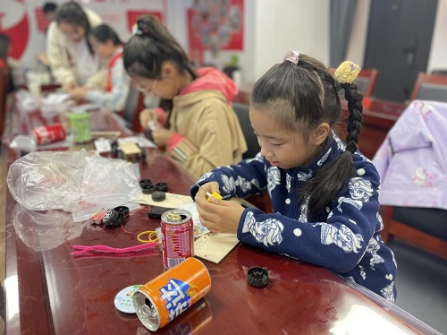 紧接着,活动进入了“变废为宝”动能小火车制作环节。在社区少儿志愿者的带领下,青少年们纷纷动手,利用废旧材料制作出了各具特色的动能小火车。在制作过程中,青少年们不仅锻炼了动手能力和思考能力,还深刻体会到了废物利用的乐趣和环保的重要性。一辆辆精致的小火车在孩子们的巧手下应运而生,成为了活动现场的一道亮丽风景线。
