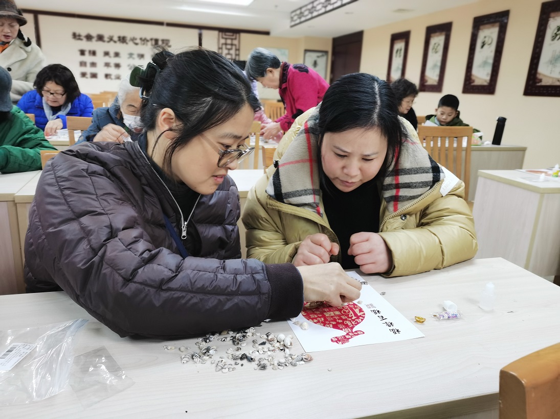 在活动的最后环节,老党员们发挥创意,利用贝壳的自然形态,精心绘制新年福字图案。他们小心翼翼地将绘制好的贝壳作品镶嵌到相框中,制作成独一无二的新年福字贝壳画相框。这些精美的相框不仅展现了他们的巧思妙想和党性情怀,更传递了新春的祝福和对党的深厚感情。