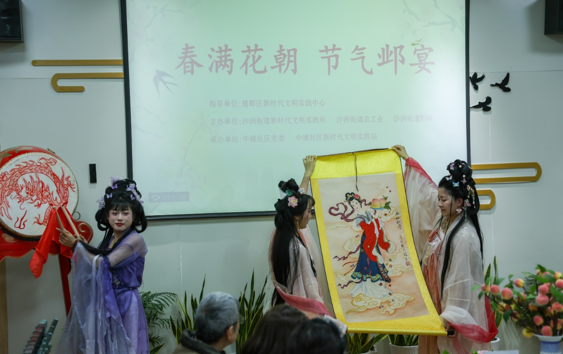 “钟鸣鼎食”环节是活动的一大亮点。身着汉服的“小花神”身姿轻盈,击鼓相迎,优雅地引领居民有序入场。随后,盥洗礼仪式庄重举行,居民们洗净双手,以虔诚之心入席。在别具匠心的九宫格餐盒里,荠菜肉圆、香椿涨蛋等特色菜品摆放精致,这些菜肴不仅应和春分节气,更蕴含深厚文化内涵。九格分别对应“君子九德”,巧妙地将饮食文化与品德教育巧妙融合。居民们品尝美食的同时,也在潜移默化中接受传统文化的熏陶。