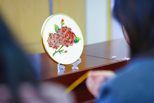 随后,动手制作环节正式开始。大家以丝为笔、以釉为彩,专注地投入到景泰蓝作品制作中。遇到困难时,她们或是向老师请教,或是与身边同伴交流探讨,互帮互助。在大家的共同努力下,一幅幅色彩斑斓、精美的掐丝珐琅画逐渐成型,玫瑰娇艳欲滴、百合清新淡雅,每一幅作品都凝聚着居民们的智慧与创意。