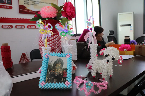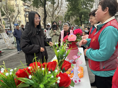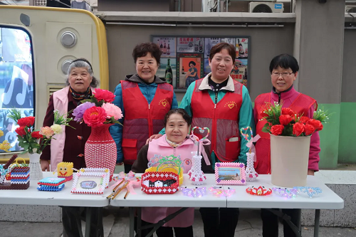 在茶亭社区的社区广场上,会定期举办爱心义卖活动。阿姨们精心制作的手工艺品整齐地摆放在展台上,串珠手链、绢花、花瓶、笔筒……。在爱心义卖中,她们将筹集到的善款捐给社区用于辖区困难群体的帮助。