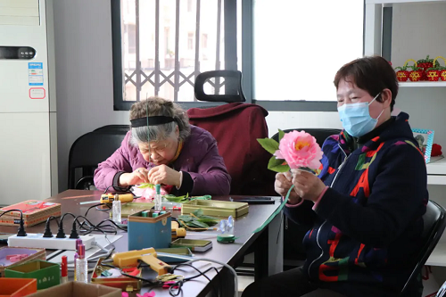 独乐乐不如众乐乐。在社区的组织下,高秀玲和小区的“老伙伴”们成立了“织梦工艺坊”。从此,10余平方米的活动室变成了她们的“快乐大本营”。一层内扣,两边两个牙口;三层内扣,大圆两个牙口……这是大富贵牡丹的做法。在外人看不懂的口诀里,高阿姨耐心地教着队员们,一边动手实践,一边搭话,队员的心也逐渐拉近了。“像这么多花,原材料其实都是丝带,花瓣要用酒精灯烫完定型,花蕊都是用针尖挑出来的,屁股不离板凳,也要做一天呢。”景阿姨说道。无论是串珠挂饰,还是玫瑰花束,都凝聚着团队的巧思。