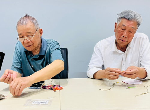 在"巧手纳福制香囊"环节,不同年龄段的居民与退役军人结对合作。通过分步讲解、现场示范,手把手教老人们编织香囊。经过一个多小时的制作,原本零散的丝、布在居民们的手中变成了形态各异的香囊,大家纷纷展示自己的成果,相互拍照留念,小小的香囊不仅承载着满满的成就感,更串联起邻里间的深厚情谊与节日氛围。