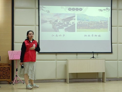 活动开始,志愿者通过播放精美的中国传统建筑PPT及建筑配图引入主题,营造出浓厚的文化氛围。随后进行20分钟的中国传统建筑美学讲解,重点介绍建筑特点、建筑美学,文化内涵等三方面,并通过互动问答调动参与者兴趣。