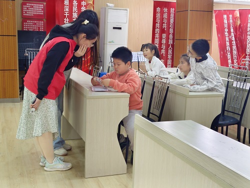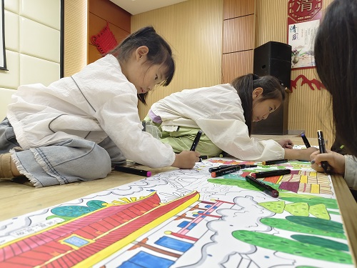进入实践环节后,组织青少年分组进行长卷画集体创作及涂色。在志愿者指导下,孩子们运用了解到的古典建筑知识以及传统色彩元素进行绘制,期间志愿者巡回提供指导帮助。创作完成后,全体参与者共同欣赏完成的长卷画作品,并进行合影留念。