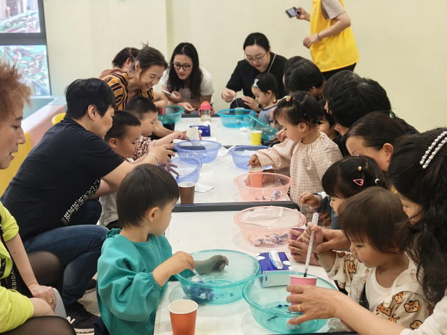 最令人期待的亲子共同完成扎染环节终于到来。家长和孩子们齐心协力,发挥创意,将白色的手帕通过不同的折叠和捆扎方式,塑造出各种独特的形状。随后,他们小心翼翼地将手帕浸入染料中,看着手帕逐渐被染上绚丽的色彩,脸上洋溢着兴奋和自豪的笑容。在等待染色的过程中,亲子间还互相交流着创意和想法,现场充满了欢声笑语。