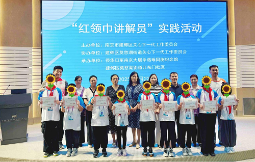 本期爱心暑托班面向江东门社区辖区内新就业形态劳动者子女招募,旨在解决暑期“看护难”问题的同时,为孩子们提供一个富有教育意义、充实难忘的假期。活动依托江东门社区辖区丰富的爱国主义文化资源构建了系统化的培养课程体系。在为期一个多月的时间里,小学员们接受了内容丰富、形式多样的培训,首先通过专题课程,学习了抗战精神、英雄事迹以及中国共产党的光辉历程,筑牢了理想信念根基,增强了历史使命感;二是锤炼讲解实践技能,邀请专业导师与社区“五老”志愿者开展语言表达、礼仪形态等专项培训,提升了综合素养和沟通能力;三是沉浸式实地探访研学,组织学员们多次前往侵华日军南京大屠杀遇难同胞纪念馆进行现场观摩学习,熟悉展陈内容,深化对历史的理解和认知。经过严格的培训和考核,最终10名优秀学员脱颖而出,组建了一支优秀的“红领巾讲解员”队伍。