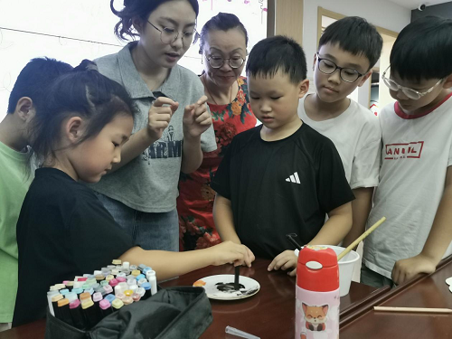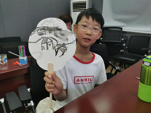“题画诗”是在中国画的空白处由画家本人或他人提上一首诗,诗的内容或抒发作者的感情,或谈论艺术的见地,或咏叹画面的意境。随后,就读于景德镇陶瓷学院雕塑专业的馨引姐姐带着孩子们和家长们共同绘制四季团扇。