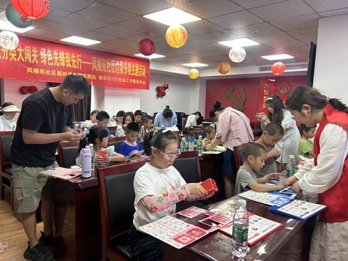 7月23日下午,建邺区莫愁湖街道凤栖苑社区关工委组织30余组亲子家庭在社区校外教育辅导站开展“垃圾分类大闯关 绿色先锋我先行”活动。通过趣味闯关、手工实践和互动承诺等形式,让青少年在体验中学习环保知识,以“小手拉大手”带动家庭共同践行垃圾分类。