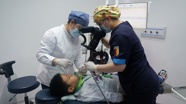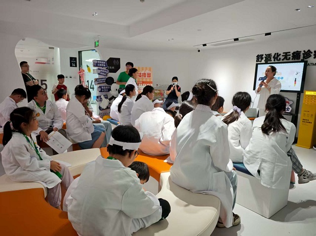 活动伊始,南京茀莱堡口腔医院的专业牙医团队为孩子们进行口腔健康知识讲解。牙医们用生动形象的语言,结合有趣的动画短片,向孩子们介绍了牙齿的结构、龋齿的形成原因以及日常护牙的重要性。在互动问答环节,孩子们积极举手提问,“为什么会蛀牙呀?”“一天刷几次牙才好呢?”牙医们耐心细致地一一解答,让孩子们对口腔健康有了更清晰的认识。随后,进入了期待已久的 “小小牙医” 实践体验环节。孩子们穿上特制的小牙医白大褂,戴上口罩和手套,瞬间变身成了一个个有模有样的小牙医。在牙医的指导下,互相检查口腔。有的小牙医认真地拿着口腔镜,查看同伴的牙齿是否有蛀牙;有的则模仿牙医的样子,叮嘱同伴要好好刷牙。现场气氛十分热烈,孩子们在亲身体验中,不仅感受到了牙医工作的乐趣,更深刻地理解了保护牙齿的重要性。