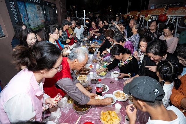 文艺表演落幕,百家宴正式上演。家家户户居民端出拿手好菜,“妈妈牌”红烧肉油亮诱人,满是家常滋味;秘制腌菜鲜香扑鼻,藏着岁月的醇厚;还有融合异乡风味的创新佳肴,展现多元味蕾体验。此外,辖区商户如龙彦利陈家鸭子、成诚酥烧饼、徐州菜馆等也精心准备特色菜品,为这场盛宴添色。百种风味、百份心意,在依次排开的长桌上汇聚成一场“舌尖上的团圆”盛宴。居民们围坐在一起,边品尝这份“多方共献”的美味,边分享烹饪秘籍,欢声笑语在月光下流淌。“最佳菜肴评选”环节将氛围推向高潮,一张张投票卡传递着认可与温情。这不仅是一场味蕾的盛宴,更是一次心灵的碰撞,以食为媒,将“陌邻”化“睦邻”,让社区真正成为有温度、有记忆的“大家庭”。
