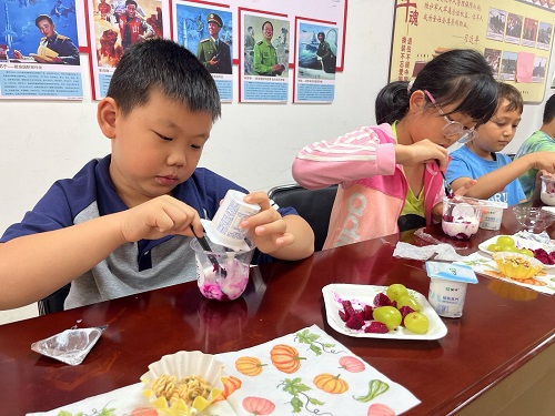 “创意工坊,秋日果实酸奶杯DIY”环节开启。在前置引导时,工作人员讲解了秋分应季水果的营养价值,着重强调“珍惜粮食,不浪费食材”。随后,在家长和工作人员的协助下,孩子们挑选准备好的水果,自己动手制作属于自己的秋分水果杯。在这个过程中,孩子们锻炼了动手能力和创造力,学习了健康饮食知识,还享受了制作和品尝劳动成果的快乐。