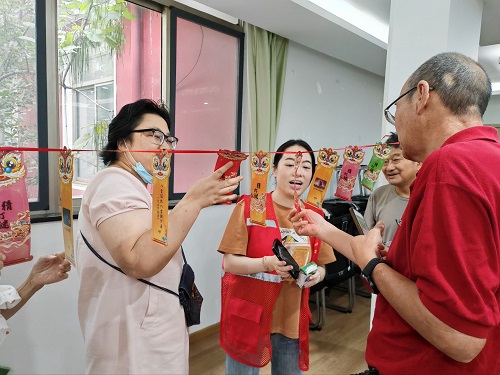 随后的“中秋游园会” 将活动推向高潮。在“猜灯谜” 游戏区,五彩的灯谜条挂满现场,谜题涵盖中秋习俗、成语典故等内容,残障人士们三五成群,认真琢磨谜面,不时交流讨论,猜中者拿着灯谜条兑换奖品,成就感满满;“海中捞月” 游戏区同样热闹,大碗内装满清水与玻璃球,参与者在规定时间内小心翼翼地用夹子夹取弹珠,成功夹起者欢呼雀跃,现场笑声、掌声不断,每一份奖品都承载着社区对残疾友人们的真挚祝福。