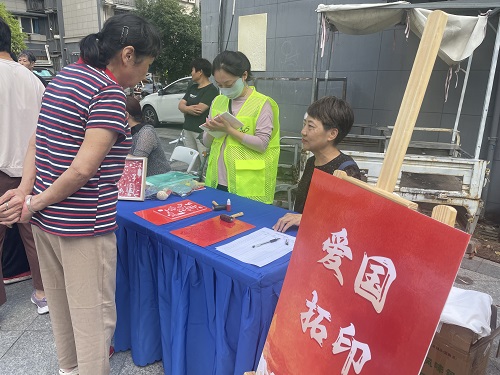 国潮手作区同样人气十足。兔儿爷灯笼制作摊位前,孩子们在志愿者指导下认真组装灯笼框架、绘制图案。“我做的兔子灯笼会发光!”一位小朋友兴奋地向同伴展示作品。爱国主题帆布包拓印和中国结编织活动也排起了长队,居民们亲手制作节日纪念品,感受传统手工艺的魅力。
