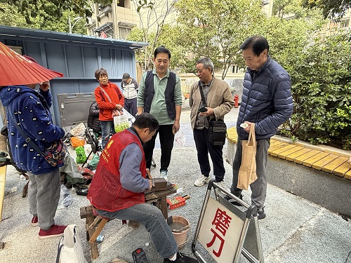 活动现场设置了多项服务内容。磨刀服务深受居民欢迎,每张票可磨1把刀和1把剪刀,解决了居民日常刀具使用的“小烦恼”;修鞋、修伞服务仅收取材料费,为居民节省了生活成本;理发服务让居民足不出户就能享受便捷的形象打理;爱心义诊环节,医护人员为居民测量血压、血糖,进行口腔检查和视力筛查,贴心的健康关怀赢得了居民的一致点赞。