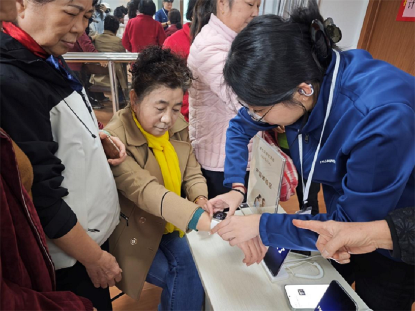 讲座结束后,智慧助老活动随即开展。社区党总支联合金陵天地华为门店的党员志愿者,为社区老年人开设“智能手机小课堂”。课程围绕中老年群体日常需求,讲解手机基础操作,如开启长者模式、添加联系人、连接Wi-Fi、使用微信视频通话等。活动中还设置了“一键微体检”环节,一款手表不仅能测量血压、血氧,还能通过各项指标反映身体的基础状况,为健康管理提供帮助。这一实用功能得到居民纷纷点赞,大家表示“这个手表真不错”。