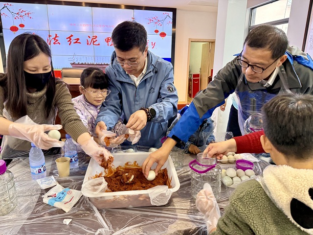 孩子们听得跃跃欲试,纷纷戴上一次性手套,在家长的协助下动手操作。孩子们小心翼翼地裹红泥,并将裹好的鸭蛋放进密封罐中,还特意贴上写有自己名字的标签,“等腌好,我要第一个送给爷爷奶奶尝一尝!”家长们也乐在其中,有的拍照记录孩子的操作瞬间,有的交流自家腌蛋的小经验,红泥的清香与孩子们的笑声交织在一起,让活动现场充满冬日暖意。
