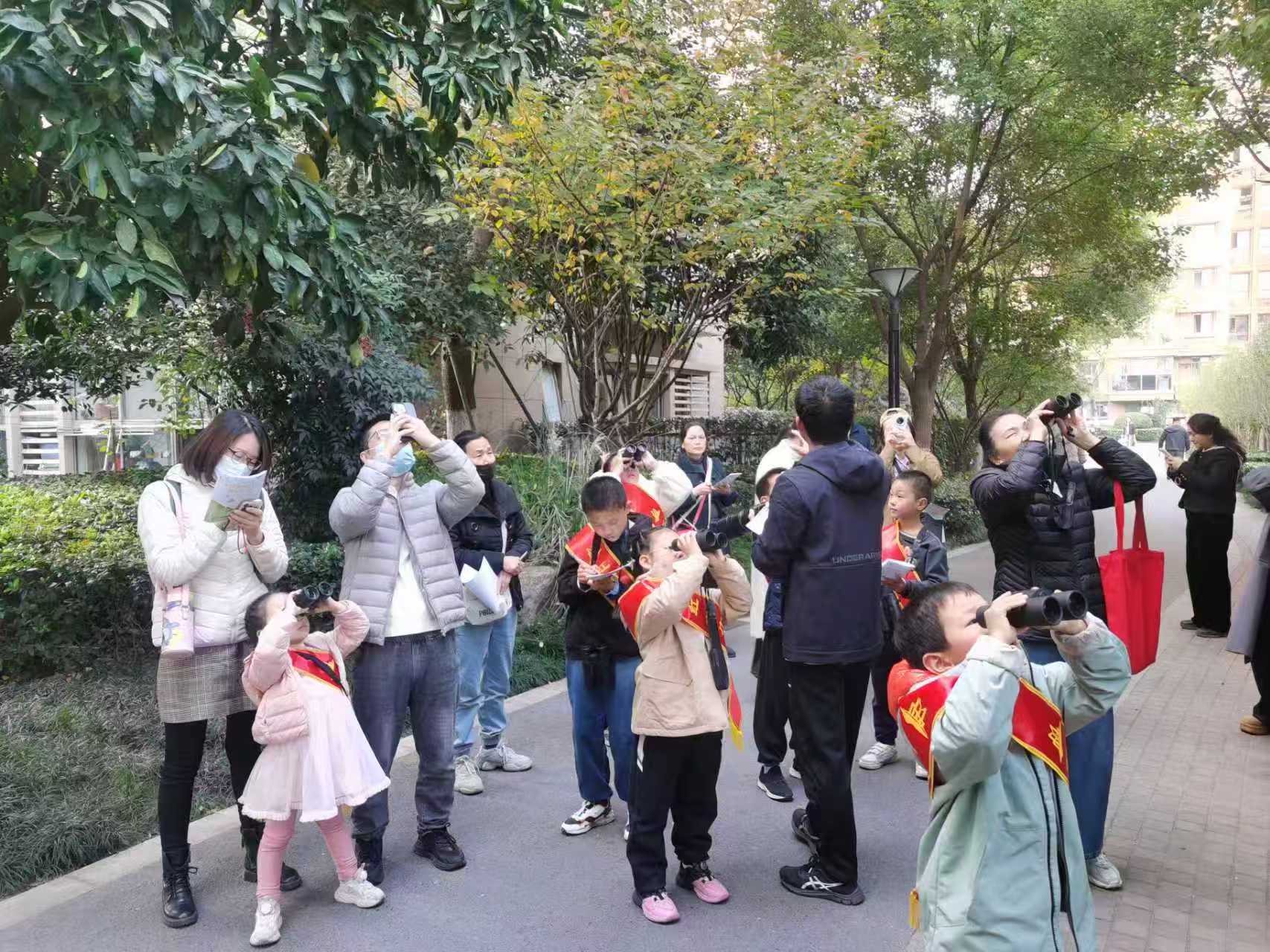 理论科普过后,亲子家庭携手走进社区和顺苑小区,开启实地观鸟体验。在志愿者老师的专业引导下,大家透过望远镜凝神观察,惊喜地发现:落叶疏朗的树杈间、高层住户向阳的窗台上,处处都有鸟儿的身影——白头鹎啄食果实、黄腰柳莺枝头跳跃、灰喜鹊结伴翩飞、珠颈斑鸠缓步踱步,六种常见鸟类的灵动姿态尽收眼底。大家一边细心观察,一边认真记录鸟类的种类、行为与形态特征,亲手完成了专属的“洲岛和园社区观鸟导览手册”。此外,老师还结合冬季生物多样性调研,带领大家探访小区内的鸟嗜植物、高大乔木与密叶灌木,这些兼具季候特色与地域适配性的植物群落,正是鸟类、小型哺乳动物与昆虫的理想家园。活动现场,亲子家庭纷纷提议,未来可共同创作鸟类科普宣传作品,让自然之美与科普知识传递给更多居民,让邻里们都能成为“鸟类邻居”的守护者与同行者。