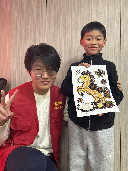 首先,大学生志愿者通过生动地讲解,为在场的孩子和家长们梳理了五谷粮食画的历史源流与文化内涵。随后的动手环节将气氛推向高潮。在志愿者们的示范与协助下,家长与孩子们围坐在一起,小心翼翼地用胶水将一颗颗圆糯米、一粒粒绿豆、红豆粘合在线稿上。这不仅是一次艺术创作,更是一场关于耐心、专注与合作的亲子体验。孩子们在“点豆成画”的奇妙过程中,直观感受到粮食的质感与珍贵,对“一粥一饭,当思来之不易”有了更深刻的理解。经过一个多小时的精心制作,一幅幅栩栩如生、各具特色的五谷骏马图陆续完成。有的骏马昂首嘶鸣,尽显龙马精神;有的则造型憨态可掬,充满童趣。