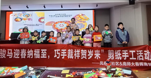 1月25日,建邺区莫愁湖街道凤栖苑社区制作少年儿童与南京师范大学大学生志愿者在社区活动室开展了“骏马迎春纳福至,巧手裁祥贺岁来”手工剪纸活动。活动以庆祝马年新春佳节,让非遗之美点亮新春,让文化传承浸润童心。