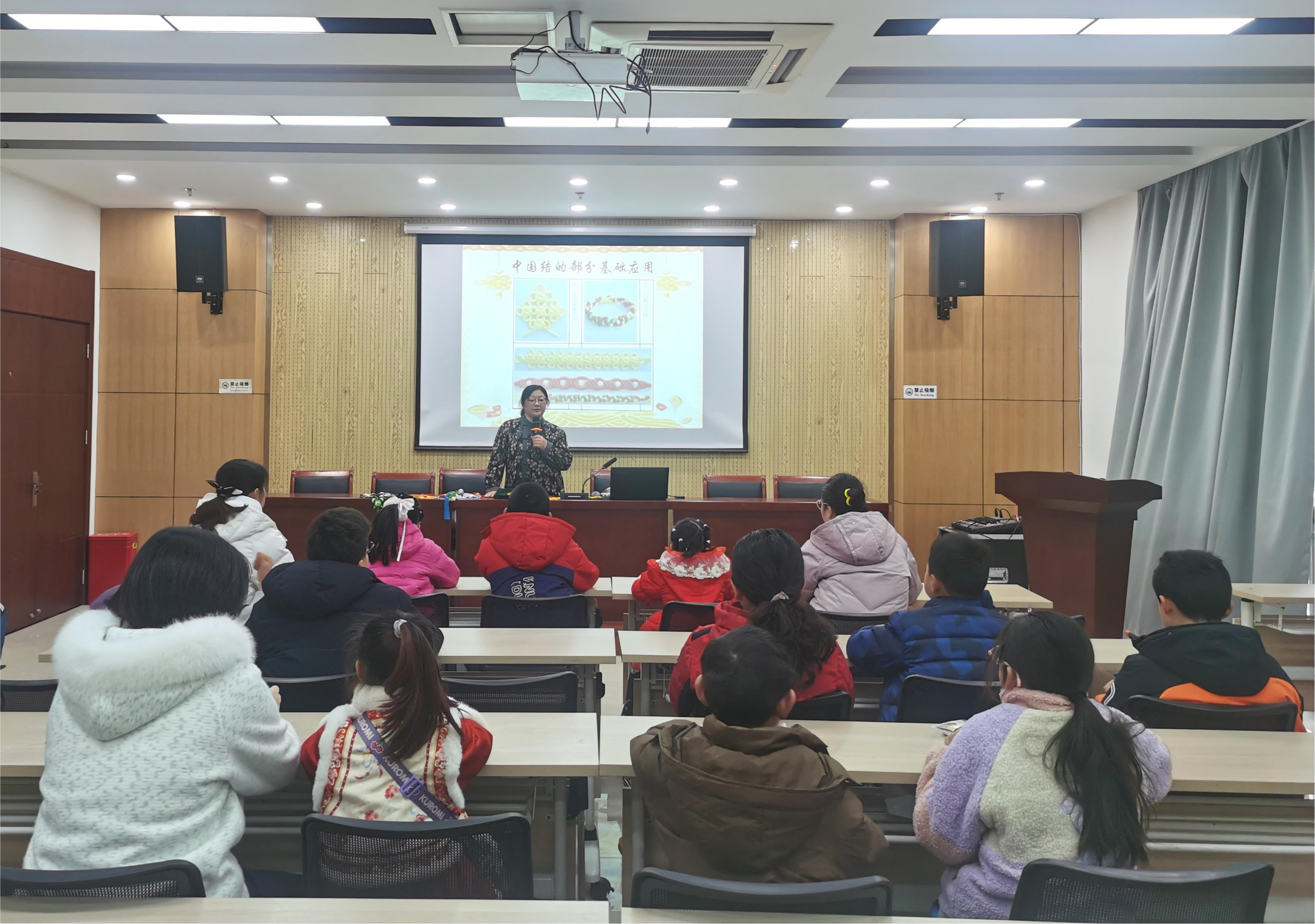本次活动特邀南京市市级非物质文化遗产传承人、绳结艺术家高志红老师亲授技艺。活动中,高老师从中国结“结绳记事”的历史渊源讲起,详解盘长结“长长久久”、吉祥结“吉庆有余”等传统结饰的文化寓意,通过趣味讲解与手把手示范,带领孩子们掌握穿、缠、绕、抽、系等核心编织技法,让每一组家庭都能完成专属的非遗手作。
