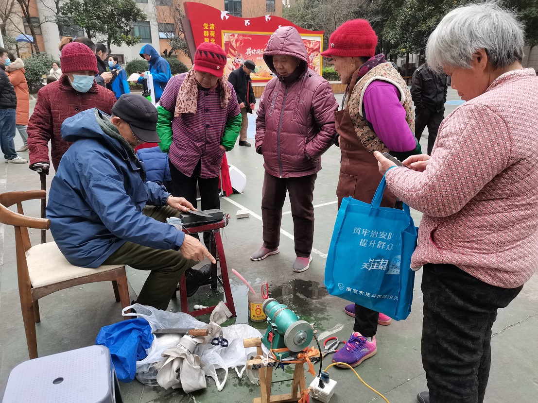 广场上,多个服务摊位有序排开,人头攒动,暖意融融。在匠心便民区,磨刀师傅熟练地操作着磨刀石,一把把钝刀重焕锋利;织补摊位前,志愿者穿针引线,细心修补衣物,居民们连连称赞“这手艺真难得”。健康义诊区同样排起长队,医护志愿者为居民免费测量血压、提供口腔检查,耐心解答健康疑问,送上春季养生小贴士。移动通讯、金融服务等咨询台前,志愿者们用通俗易懂的语言讲解智能手机使用技巧、防范电信诈骗知识,帮助居民守好“钱袋子”。