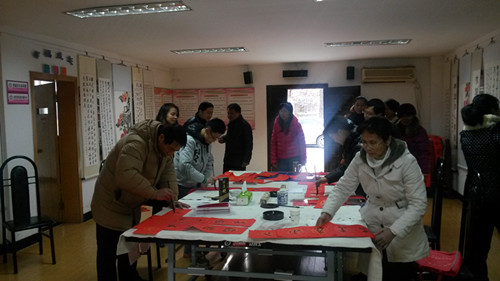 为迎马年新春, 2014年1月21日上午积善社区书法协会会员在社区活动室举行了“写春联 送居民”活动。