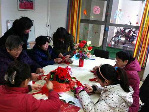 2014年2月26日上午,香山路社区组织居民来到爱杺树志愿服务中心一起学习制作手工花。居民们认真地听取工作人员的步骤介绍,然后自己动手制作。居民们对于手工花的制作由陌生到熟练,逐渐掌握了每个制作步骤的关键。居民对手工花都很感兴趣,同时也很感谢社区为她们创造了这次的学习机会。