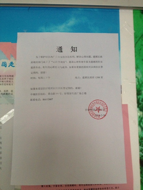 在“三八”国际劳动妇女节来临之际,建邺区政府为了维护辖区内广大劳动妇女的合法权益,关注其精神需求,解决心理问题,成立了“心理咨询室”。中城社区在接到上级部门的通知后,积极开展工作,通过QQ群、飞信、公告栏等方式通知广大居民,为有需要的妇女同志解决心理问题。