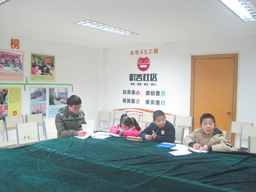 2014年3月1日上午,在积善社区的课外辅导中心,来自南京师范大学的志愿者义务为积善社区的外来务工人员的子女辅导课后作业。孩子们安安静静地坐着学作业,不时询问大学生志愿者习题,最后大学生还手把手教孩子们唱简单的英语歌曲。最后义务辅导在一派愉快和睦的气氛中度过了上午三个小时的时光。