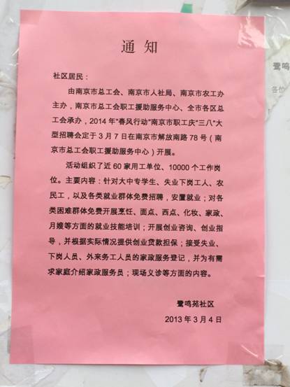由南京市总工会、南京市人社局、南京市农工办主办,南京市总工会职工援助服务中心、全市各区总工会承办,2014年“春风行动”南京市职工庆“三八”大型招聘会定于3月7日在南京市解放南路78号(南京市总工会职工援助服务中心)开展,活动组织了近60家用工单位、10000个工作岗位。并为有需求家庭介绍家政服务员;现场义诊等方面的内容。如辖区居民有此需求,届时可前往咨询面试。