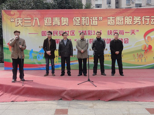 2014年3月7日上午,国泰民安社区携手《金陵晚报》在安泰广场举办了“庆三八 迎青奥 志愿服务行动”暨第六届“金陵杯”趣味运动会。活动由社区党委书记王文宁同志主持,建邺区委宣传部部长仲兆林出席活动并讲话,南苑街道工委书记陈琎、办事处副主任李世民、莫愁职校和江苏城市学院志愿者代表等领导和嘉宾出席活动。