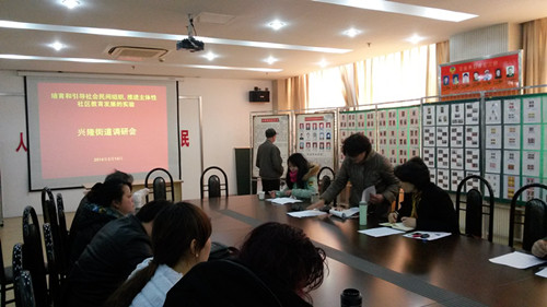 2014年3月13日下午,积善社区教育专干参加由兴隆街道举办的“培育和引导社会民间组织,推进主体性社区教育发展的实验社区调研会”。与会人员有区培训学院张校长及老师一行、兴隆街道社区教育庄老师、各社区教育专干和社区民间组织负责人等。