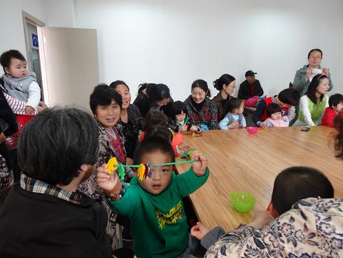 2014年3月28日,奥体社区居民学校内喜气洋洋,热闹非凡。20多位0-3岁的小朋友及家长聚集在这里,奥体艺术幼儿园的老师也来了,大家一起玩亲子游戏。活动刚始,幼儿园的范老师拿出一个布娃娃,鼓励小朋友们谁愿意主动介绍自己就让布娃娃抱抱他,小朋友们都自告奋勇地举走小手来。然后范老师又像变魔术一样拿出一个五颜六色的方形盒子,从里面拿出一个黄色小手,鼓励小朋友说出它的颜色就奖给他,这下,小朋友们更积极发言了,然后范老师依次拿出绿色 、红色让小朋友们辨别。送完了彩色小手,范老师又拿出一把彩色条和各色带孔的小方片,这是在锻炼小朋友的动手能力,在家长不帮忙的情况下,让小朋友自己把小方片用彩条穿起来,谁穿好了举手,老师就在他小手背上贴一个小星星。小朋友们认真地做着,家长开心地看着,笑着。最后,在音乐“小猪抱抱”中,小朋们与家长一起唱着、跳着,活动圆满结束。