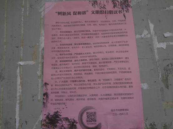 在清明节即将来临之际,为弘扬安全、文明、节俭的现代殡葬新风,确保清明节期间祭扫健康、文明、绿色、有序进行。4月1日上午,鹭鸣苑社区在辖区宣传栏内张贴“树新风 促和谐”文明祭扫倡议书。向居民朋友们发出以下倡议:一、转变思想观念,树立文明祭扫新风;二、发扬传统美德,树立厚养薄葬观念;三、保护生态资源,严防森林火灾发生;四,鼓励错峰祭奠,避免交通拥堵;五,树立文明新风,维护良好城市形象;六,广大党员、干部要以身作则,率先垂范。为提升城市文明水平、构建和谐南京作出应有的贡献!