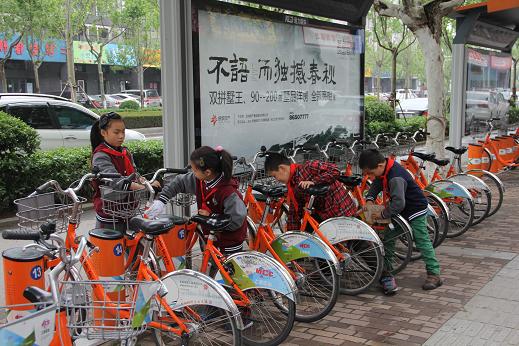 2014年4月20日,奥体社区红领巾志愿者在关工委的组织下参加“迎青奥、大干一百天”环境卫生专项整治活动。9点半活动开始,同学们9点就带着抹布早早地来了,他们志愿服务地点是公共自行车停放处,因为近几天一直在下雨,自行车已经很脏了,红领巾志愿者们都要求擦洗环保自行车。有人问小朋友们为什么不是捡垃圾和其他什么的,而这次选择擦环保自行车呢,他们说,因为青奥会马上要在南京召开了,奥体中心将是青奥会的主场馆,会很多外国人来这里,希望我们的环保自行车干干净净,让他们放心使用,维护好我们东道主的形象。