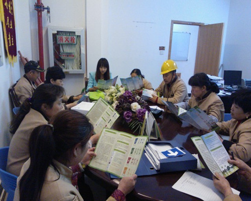 从点滴做起,一起携手垃圾分类,以崭新面目迎接青奥! 目前全市都在动员,“大干一百天,环境大扫除”专项整治行动。环境卫生问题迫在眉睫。保洁员在当中作为一个重要角色。为了维护环境卫生、规范垃圾分类桶的摆放、对垃圾分类知识的认知。2014年4月23日,中胜社区工作人员在宋都锦园物业办公室对保洁员开展了垃圾分类广场知识培训。培训内容分为二个阶段:一、在锦园园区以一个分类桶摆放点位做示范,告诉他们一个点位放置三个桶,分为绿色厨余桶、黄色其他桶、蓝色可回收桶,分别应该放置什么垃圾;二、在物业办公室,给园区连保洁员主管内的10个保洁员每人分发垃圾分类宣传折页,详细讲解了垃圾分类知识,并举例说明,并给保洁员传阅了垃圾分类培训资料,培训后保洁员对垃分知识有一定了解,并会在日常生活中提醒居民正确投放。