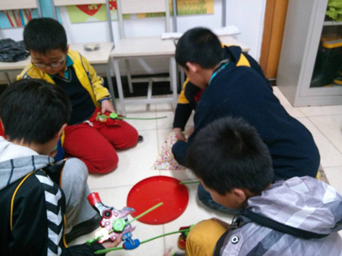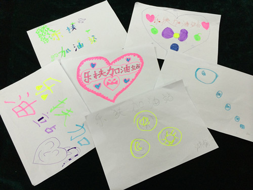一个小时的课业辅导后,男生们开始了陀螺大战,玩的不亦乐乎。之后,工作者万颖杰开始主持今天的主题活动——“我型我秀”。首先告诉小朋友们本次活动的主题内容是设计“乐扶加油站”项目的logo,然后让大家发挥想象力,画出自己心中“乐扶加油站”的logo。画的过程中,田野小朋友手托着小脑袋在想怎么设计每个字会比较好,他别出心裁的在“油”字上“冒”出了几滴油,非常有创意。另外三位小朋友更是将“爱心”元素加入到了创作的logo中,所有小朋友都画的非常认真,而且画的非常漂亮,充分表达了她们对“乐扶加油站”项目的喜爱。