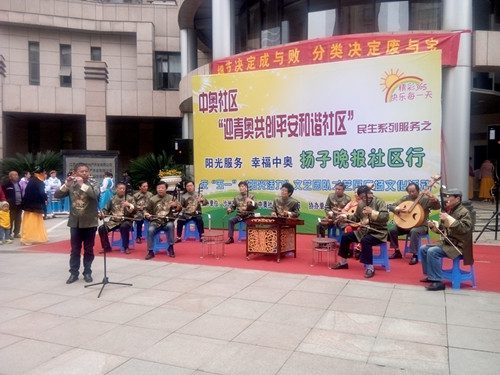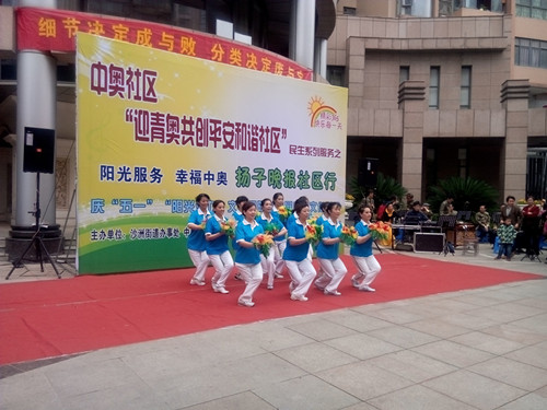 2014年4月26日上午,中奥社区与扬子晚报联合举办“迎青奥共创平安和谐社区”大型广场活动。现场社区邀请沙洲街道综治办主任以及沙洲派出所所长共同参加,同时社区团队还为大家带来精彩的演出节目,舞台下方还有免费的义诊服务、计生咨询、心理咨询,最受老百姓喜欢的应该是老行当服务,在奥体这样的新城区能找到磨刀和修伞的师傅真是不容易啊。对于社区举办的此次民生广场活动居民们纷纷表示感谢。