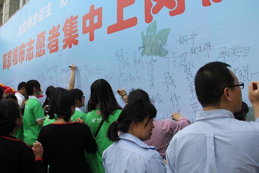 2014年5月8日,南京市文明办、志愿者协会联合奥体社区举办“迎青奥倒计时100天、南京成城市志愿者集中上岗启动仪式”。大会由市文明办副主任、市志愿者协会执行副会长吴静主持,市委宣传部副部长、市文明办主任、市志愿者协会常务副会长曹劲松讲话。大会为南京志愿者之星颁发奖章和证书,为城市文明市民督导员代表颁民聘书,城市志愿者代表发言,全体志愿者集体宣誓。活动高潮部分是全体志愿者在签名墙上签名,最后各地志愿者学习、观摩了奥体社区城市志愿服务服务台、城市志愿书吧、58058080便民热线、社区课堂、筝情之家、“全民付”银联便民服务终端设备等。