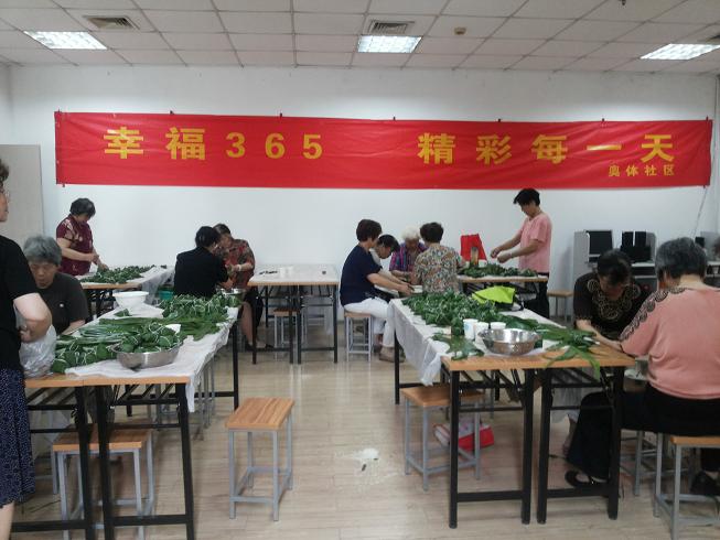 2014年6月1日下午1点,奥体社区联合建邺区苏服老年人服务中心在奥体社区会议室内组织开展“迎青奥、棕香飘情送温暖·端午快乐行”活动。此次活动得到了辖区内部分会包粽子的居民大力支持,大家现场包粽子,为万福园敬老院及社区独居、空巢老人献爱心。采一株长寿的艾叶,包一些香甜的粽子,多一个幸福的微笑!收到粽子的老人们满心欢喜。