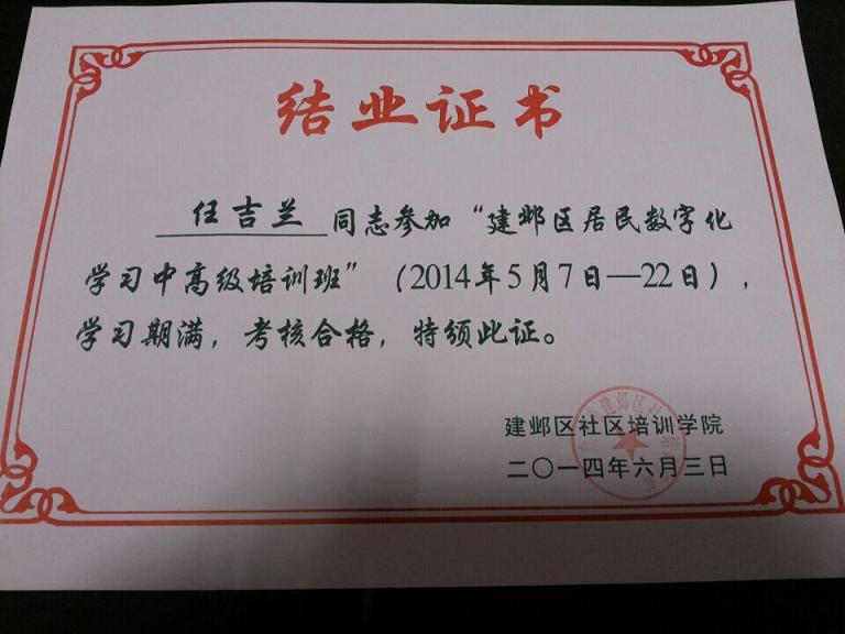 奥体社区数字化学习团学员任吉兰参加高级班学习顺利结业