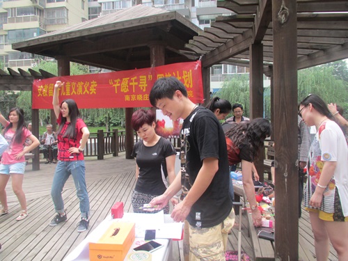 2014年6月28日,香山路社区爱杺树志愿服务站组织南京晓庄学院的大学生志愿者成员组成的爱心志愿者团队在紫鑫中华广场的小广场开展义卖活动。在小广场摆放的商品有图书、杂志、玩具等,被标上了非常低的价格向市民出售,所得收入将全部捐给安徽的留守儿童。