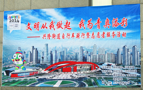 2014年7月6日距离青奥会开幕还有41天。今天上午,由建邺区文明办、兴隆街道主办,区卫生局、江心洲街道、南京电视台、金陵晚报、南京晨报协办的“文明从我做起,我为青奥添彩——兴隆街道自行车骑行暨志愿者服务活动”在奥体社区广场隆重举行。建邺新城作为青奥会主场馆所在地,理所当然地成为南京乃至全国的文明示范窗口,作为生活和工作在这里的我们,将怎样从文明做起,怎样为青奥添彩?奥体社区翠衫园小区居民代表王永清如是说:“每一个微笑、每一句温馨的话语、每一次力所能及的帮助,都将为青奥会的精彩举办增光添彩”。期间,兴隆街道的广大干部群众也将以身作则,以满腔热情投身到文明礼仪的宣传和志愿服务引领中去,大力弘扬“奉献、友爱、互助、进步”的志愿精神,广泛培育志愿文化,让不同种族、不同肤色、不同语言的人们在建邺都能体会宾至如归的感觉,为全区迎青奥再聚正能量。活动现场,兴隆街道各科室还为居民提供各类便民服务,有法律咨询、政策宣传、劳动保障、安全生产等。
