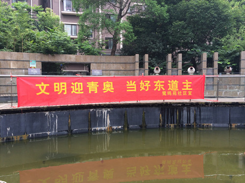 为迎接青奥盛会,7月7日上午,鹭鸣苑社区在辖区各个小区悬挂横幅并在宣传栏内张贴青奥宣传画,为辖区居民普及青奥知识理念,同时也动员居民朋友们积极参与到青奥活动中去,进一步激发广大市民“文明迎青奥,当好东道主”的主人翁意识,引导更多的居民群众关心青奥、支持青奥、参与青奥、奉献青奥。